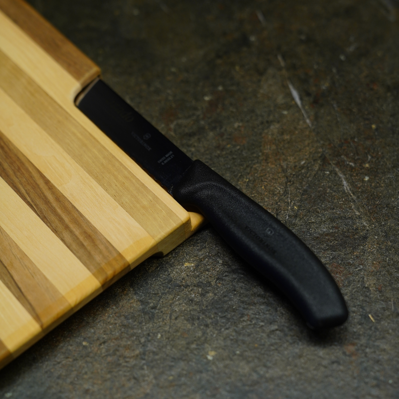 Clevere 2-in-1 Lösung: Das Victorinox Messer lässt sich sicher und platzsparend direkt im Schneidebrett verstauen, ideal für unterwegs oder die ordentliche Küche.