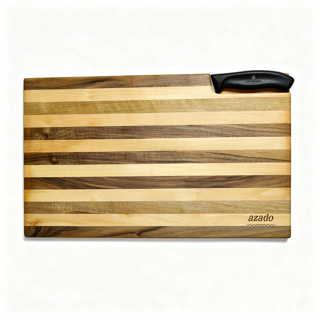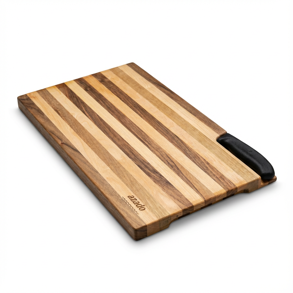 Dieses Set vereint Schweizer Präzision mit handwerklicher Ästhetik. Das massive azado Holzschneidebrett besticht durch seine markante Streifenoptik und die clevere