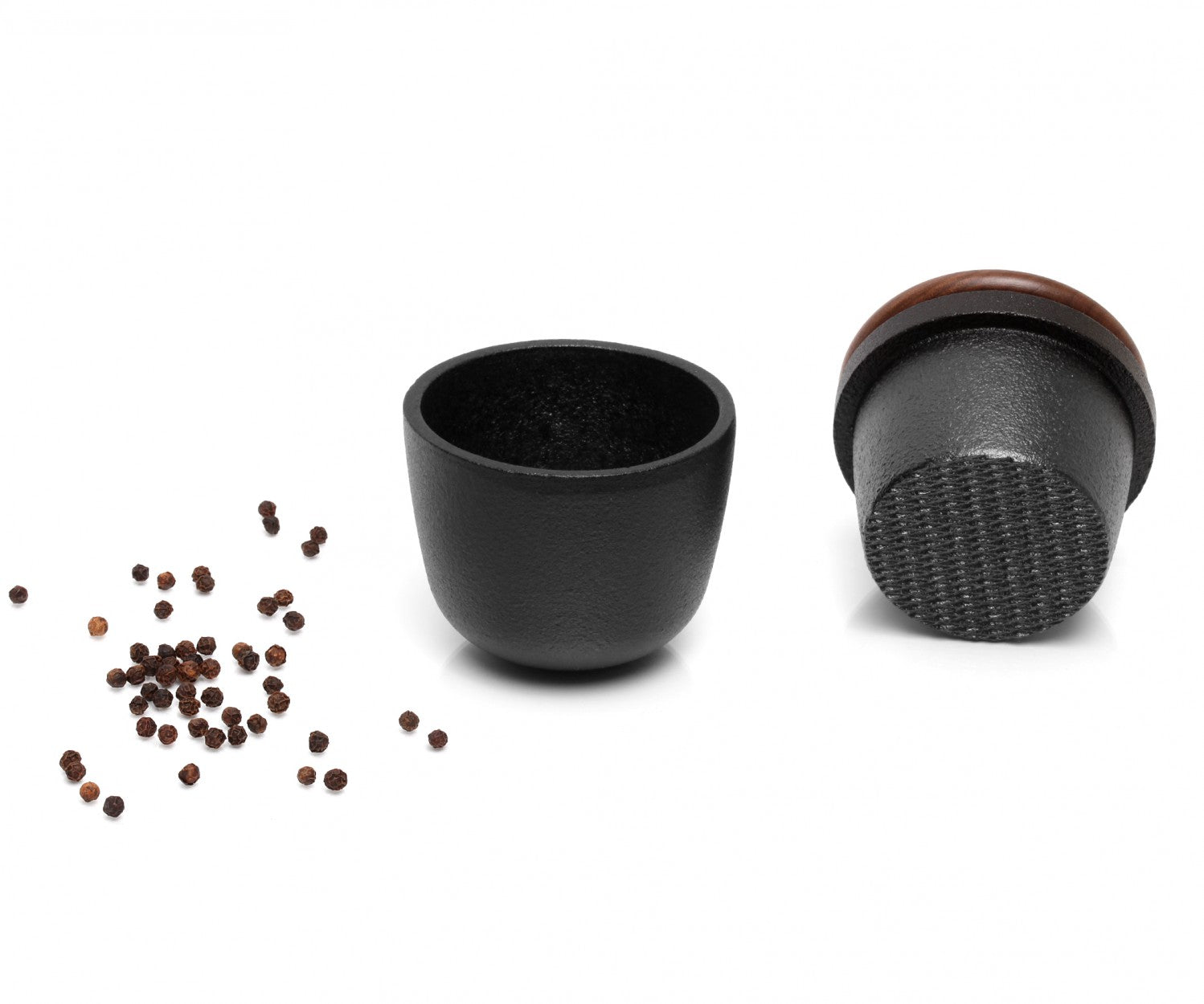 Mahlen Zum Mahlen legen Sie die Gewürze in den unteren Behälter. Mit der Unterseite des oberen Behälters können Sie Ihre Gewürze mit wenigen Umdrehungen nach Belieben fein mahlen. Die Gewürzmühle aus Gusseisen ist besonders schwer, damit Sie ohne grosse Druckausübung und Anstrengung mahlen können.