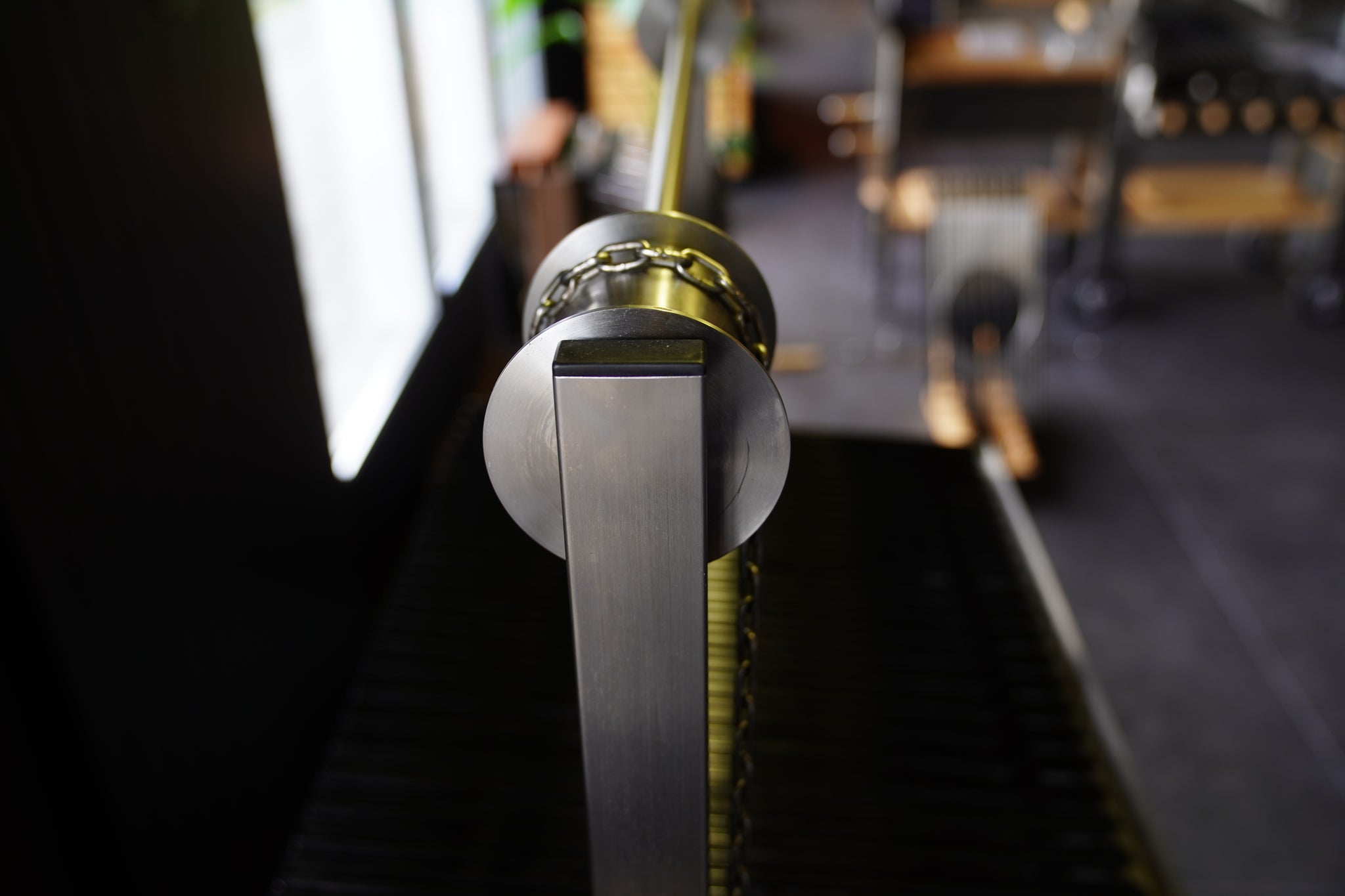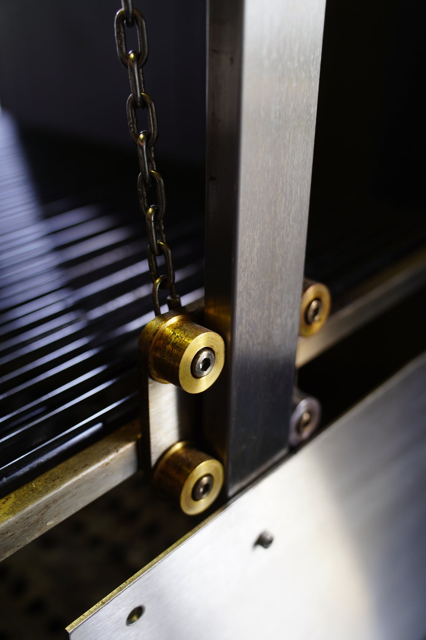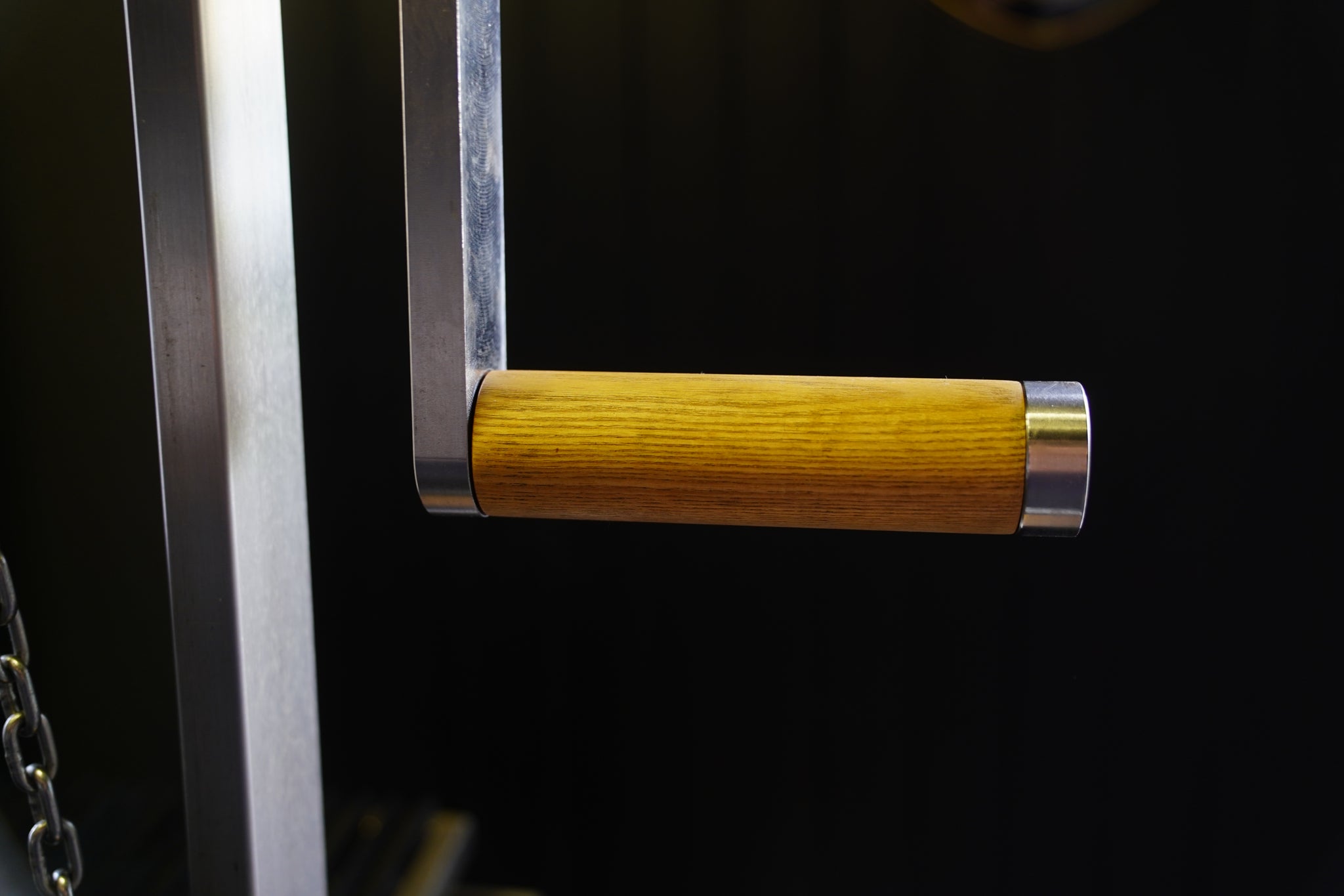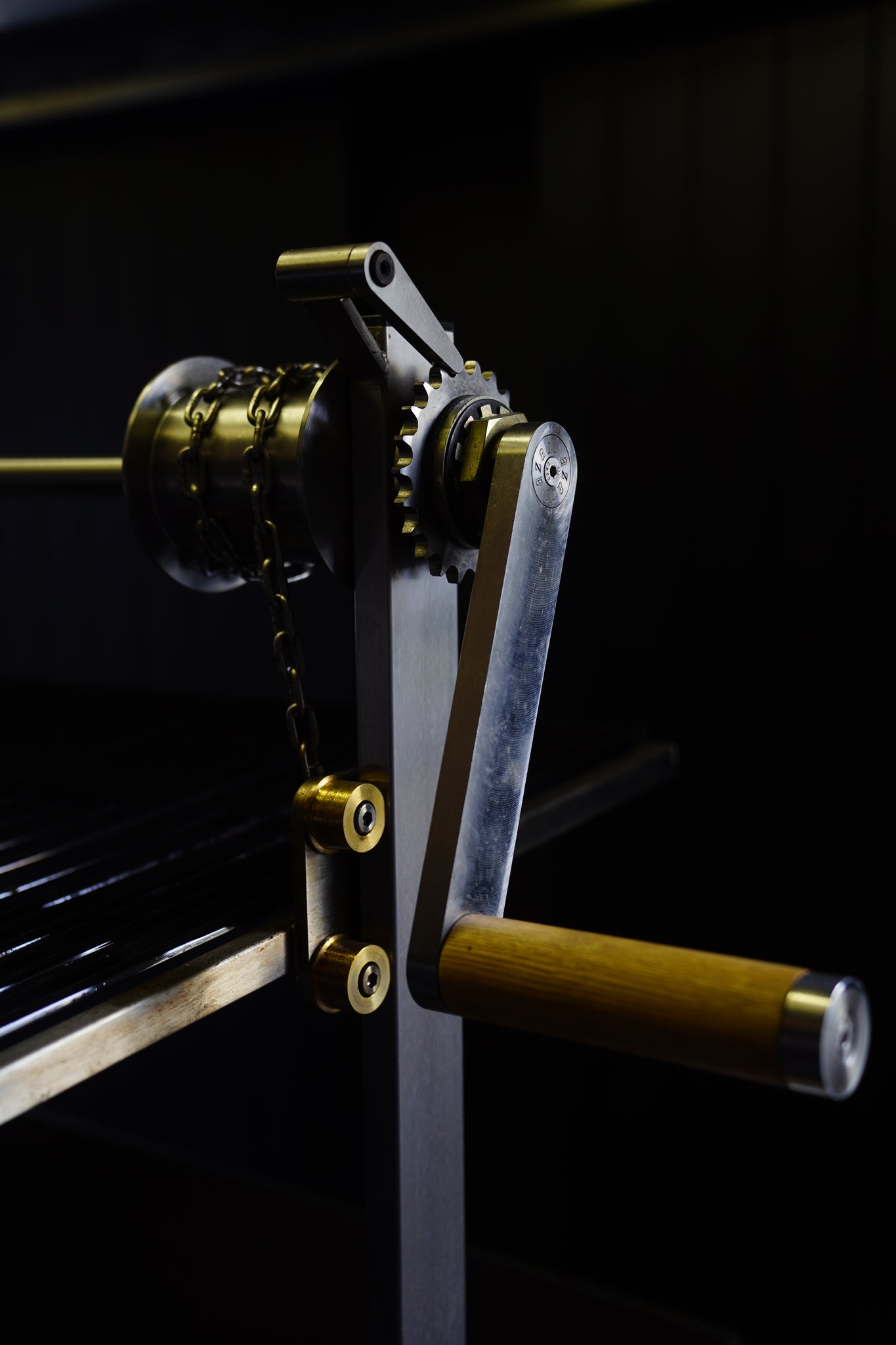 Die Höhe des Rosts kann stufenlos verstellt werden. Über eine raffinierte Kupplung mit Zahnrad ist dies im Handumdrehen möglich, kinderleicht und das alles mit nur einer Hand. Die Höhenverstellung kann auch dem Gewicht angepasst werden, das den Rost belastet.